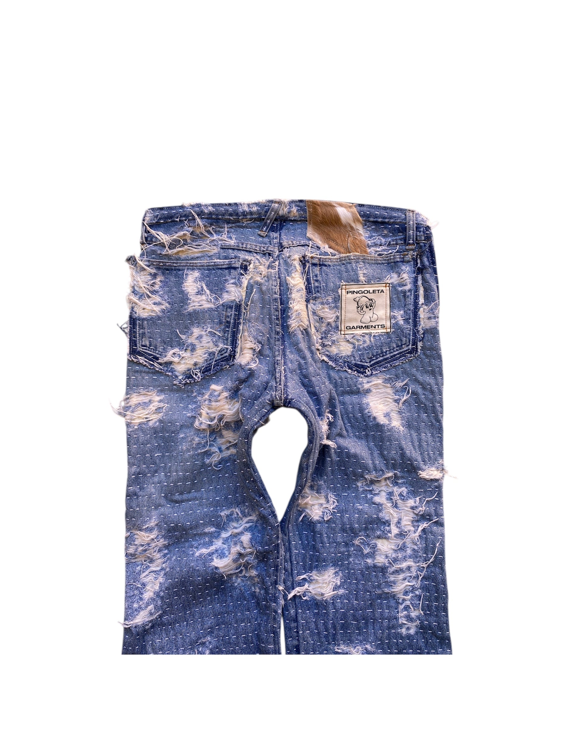 pantalón con técnica boro/ sashiko, hecha con hilo japonés para sashiko, aproximadamente 150/ 200 horas.